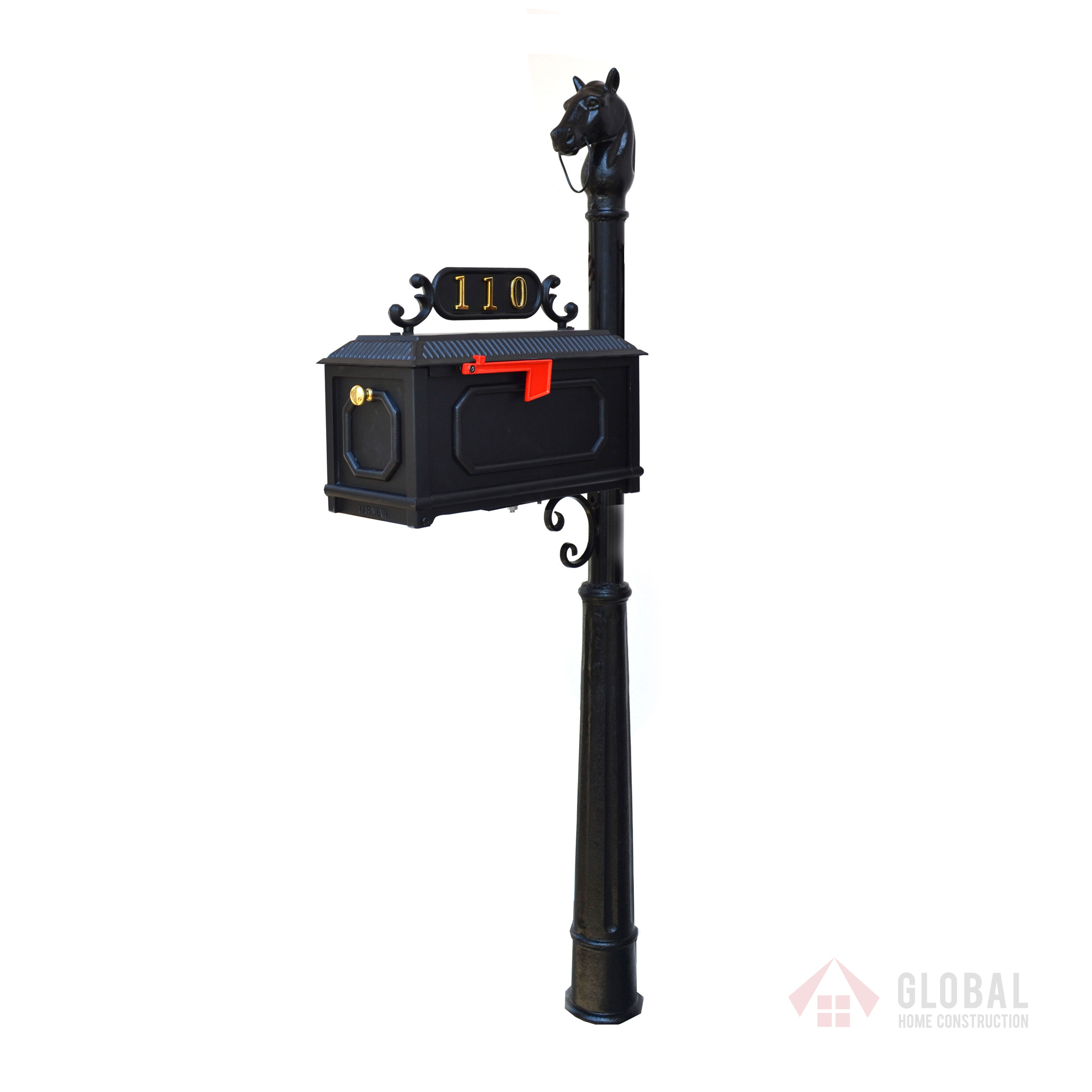 Post mailbox with a slide flag or traditional flag. Powder coated. Gold raised numbers available. Poll Material: Cast iron powder coated
